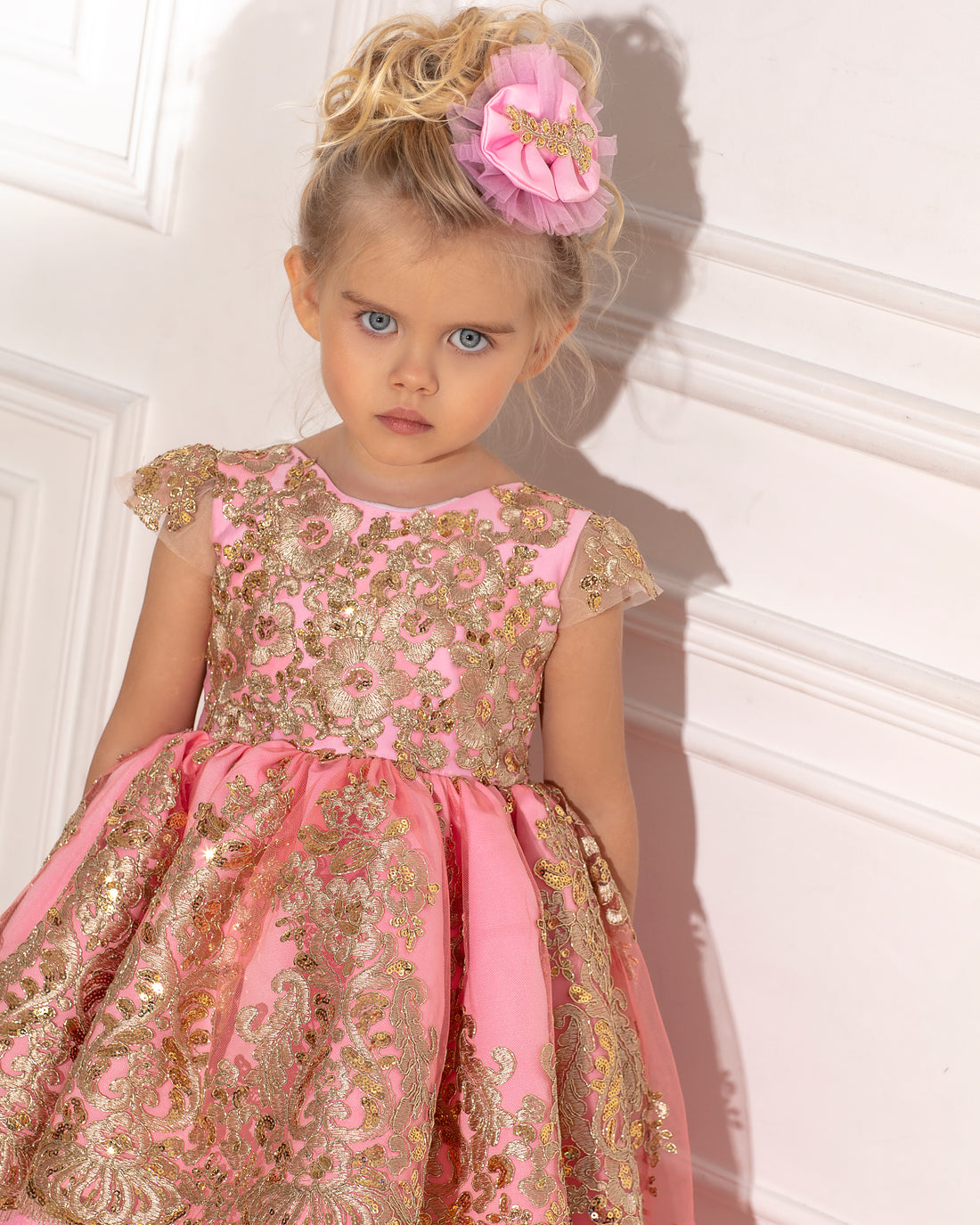 Our breath taking Pink golden lace Dress is made of cotton, tulle and satin giving an Elegant look to Children's Couture!